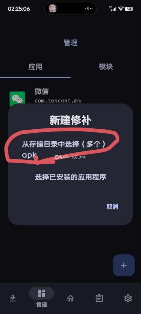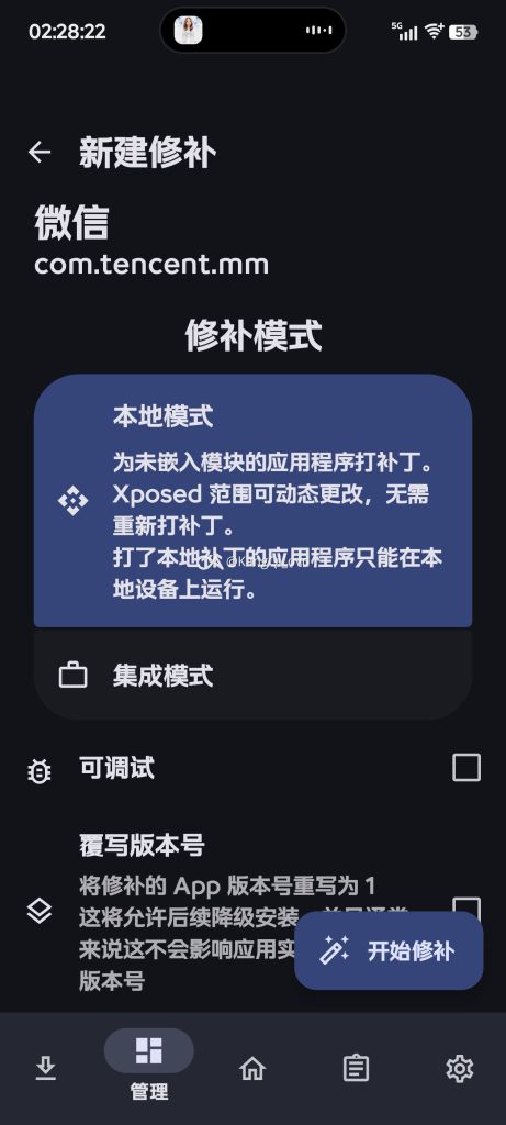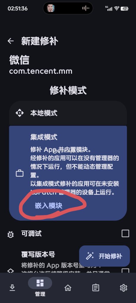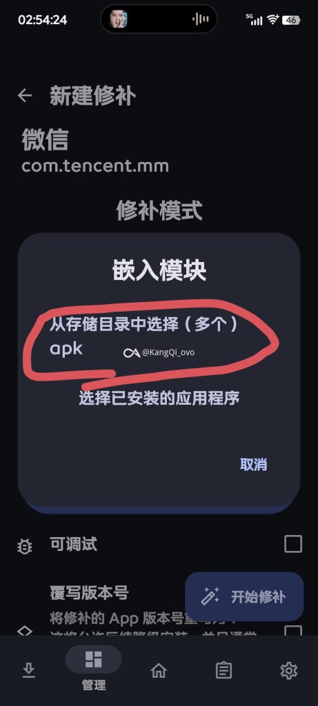 集成模式教程:前面步骤和本地模式差不多 选择要修补应用的apk即可 然后在修补模式这一步选择集成模式 并选择要嵌入的模块即可(如图19 图20)