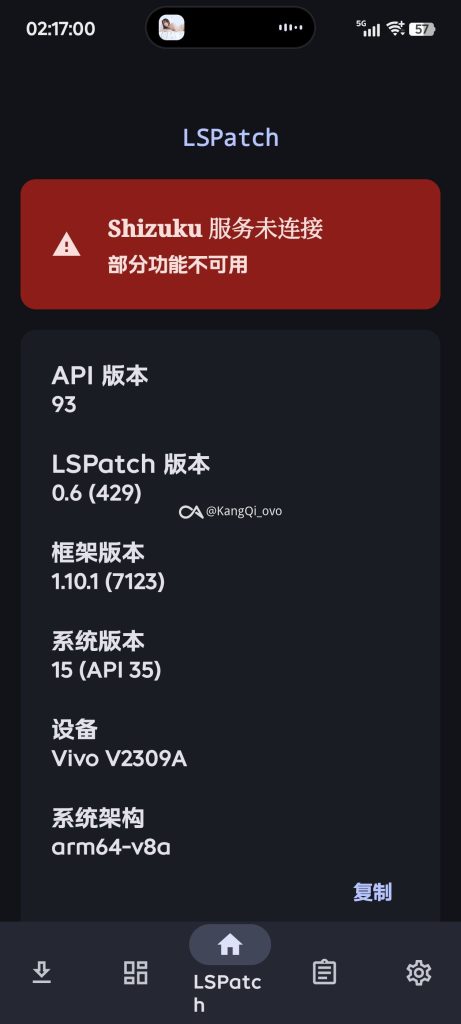1.刚打开LSPatch时显示未激活状态 如果已经对shizuku完成配对 会对LSPatch弹窗提示授予shizuku权限 允许即可(如果多次不成功可以尝试重启app)