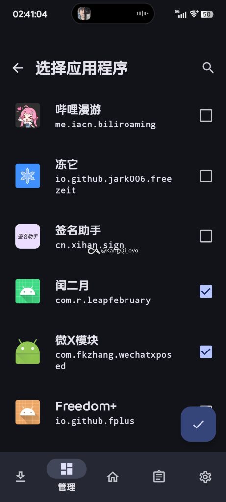 你就能在LSPatch看见你刚才修补好的app了 点击模块作用域(如图17) 就能看见你手机里的所有LSP框架的模块了 选择模块并打勾就行(如图18) 重启你所修补好的app即可