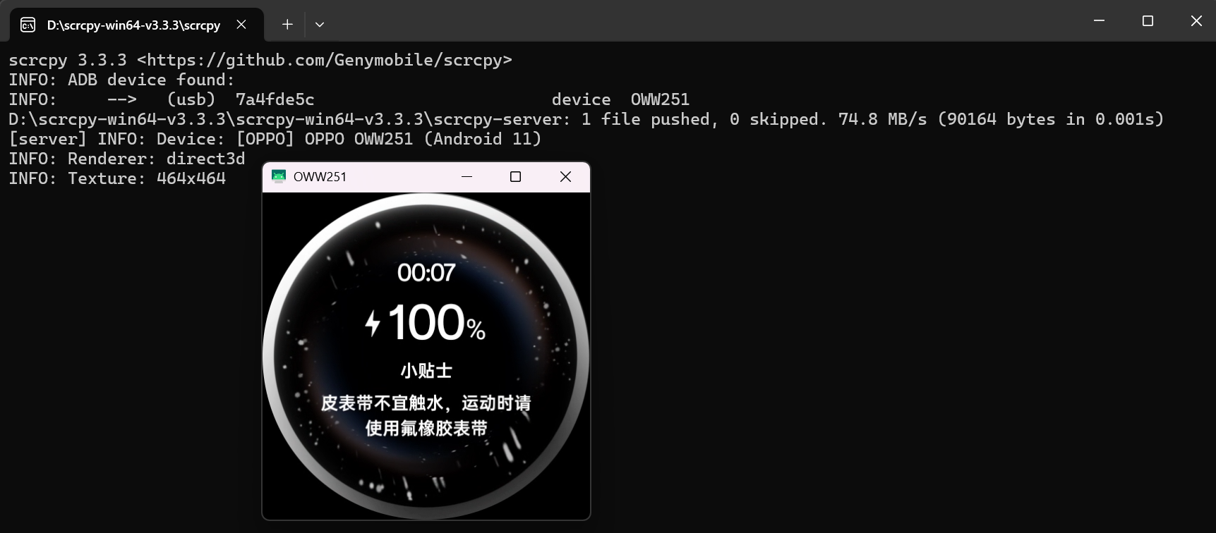 3.电脑上解压 并双击运行程序 操作没问题的话 打开scrcpy就能直接连上手表