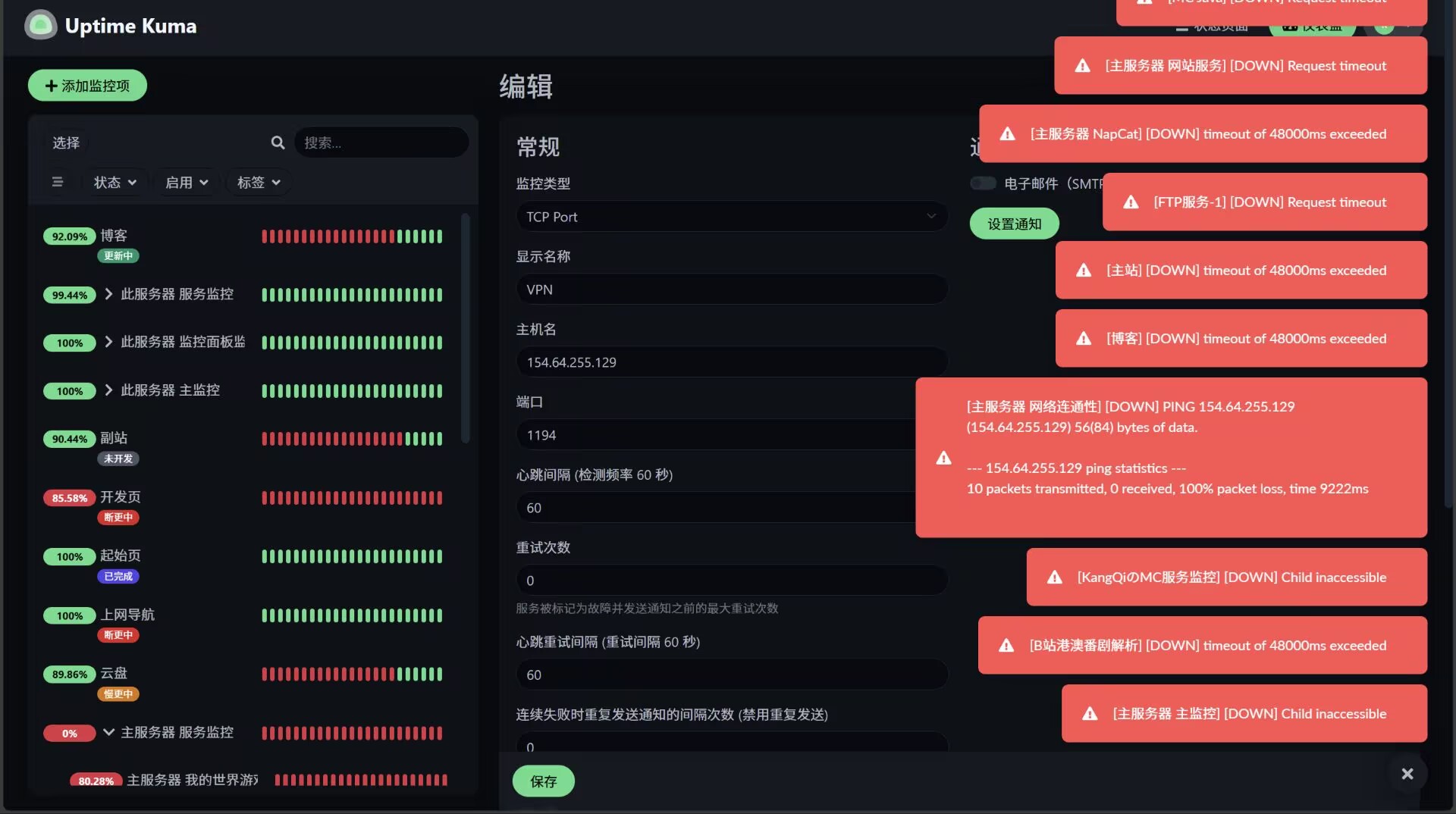 现在服务已经基本恢复 (其实VPN服务是正常的 只不过重启后从TCP协议变成UDP了 导致Uptime Kuma检测不到TCP对应的端口就显示掉线了 )